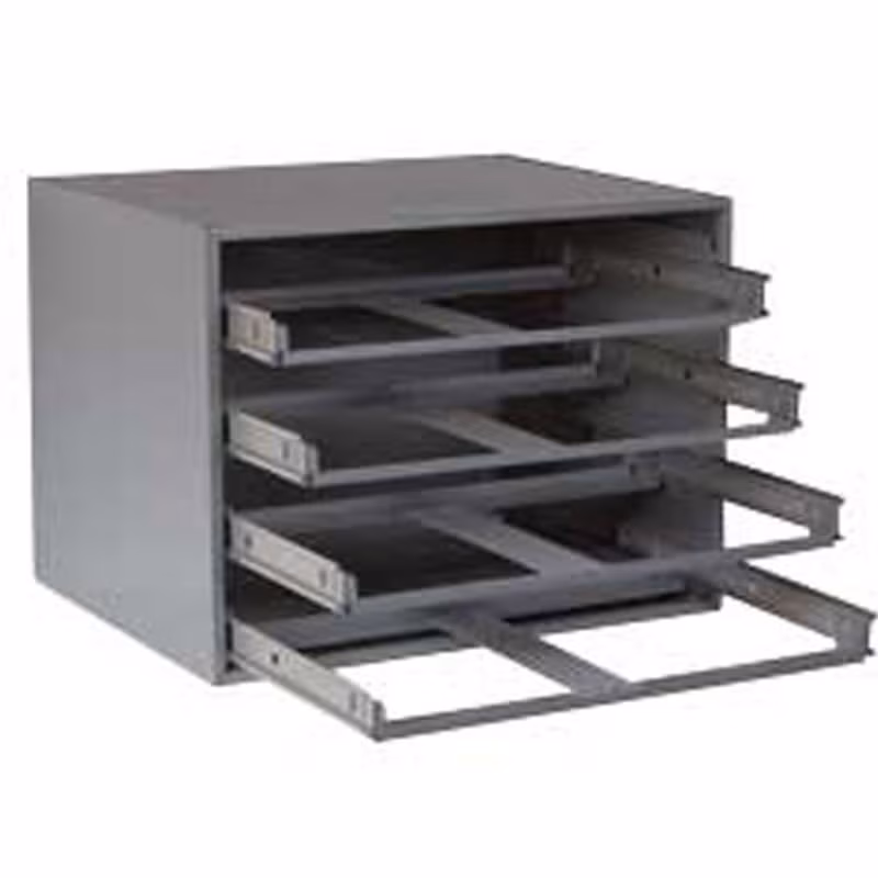 Holds 4 metal parts tool boxes Saves space by allowing boxes to remain in rack while being opened.