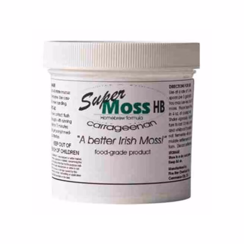 SUPER MOSS is a negatively charged, red seaweed based, Kapa and Lambda carrageenan coagulant designed to attract the positively charged, haze forming proteins together in the brew kettle and primary fermenter then settle out. Supper Moss has been formulated to mix rapidly in cold water. This feature allows it to be added directly to the bowl without creating fish eyes of un dissolved carrageenan. Properly used, it can help reduce chill haze.